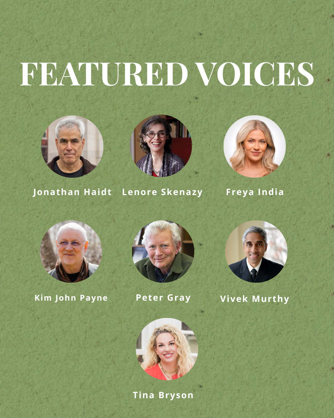 Vivek Murthy — Physician and two-time U.S. Surgeon General (under Obama and Biden). He became a prominent voice on the adolescent mental health crisis, issuing a major advisory in 2023 calling for stricter regulation of social media platforms due to their effects on youth wellbeing.