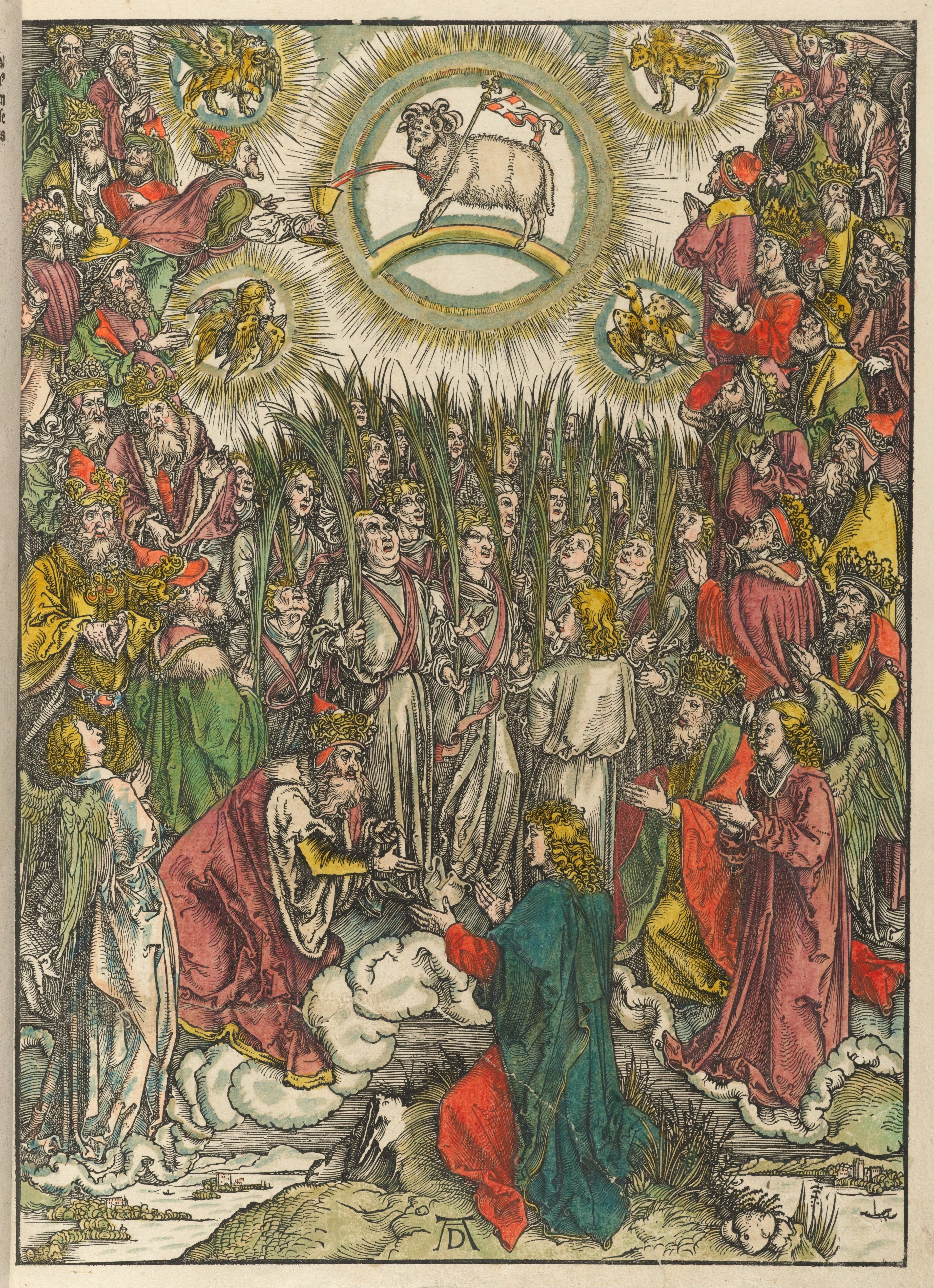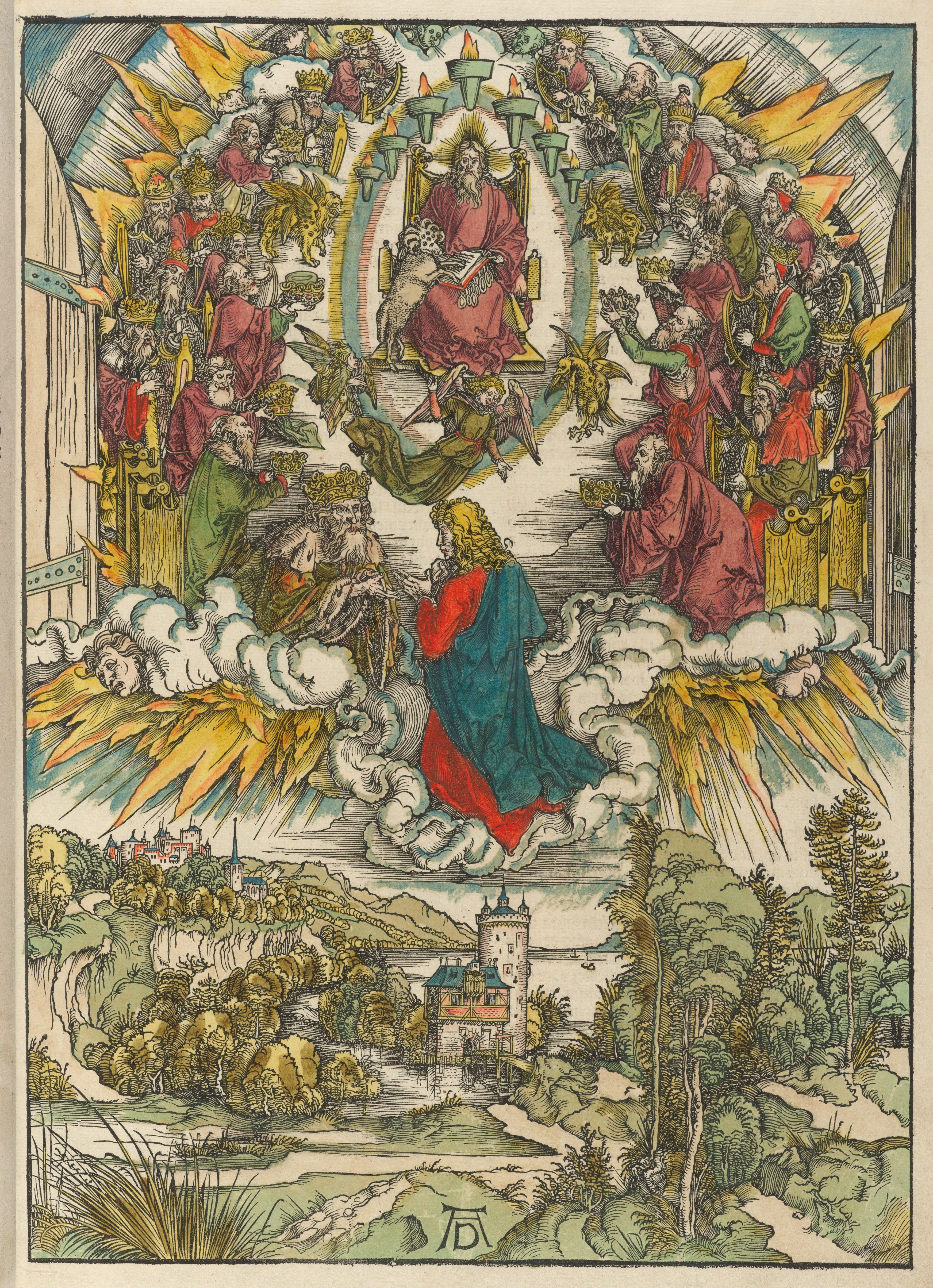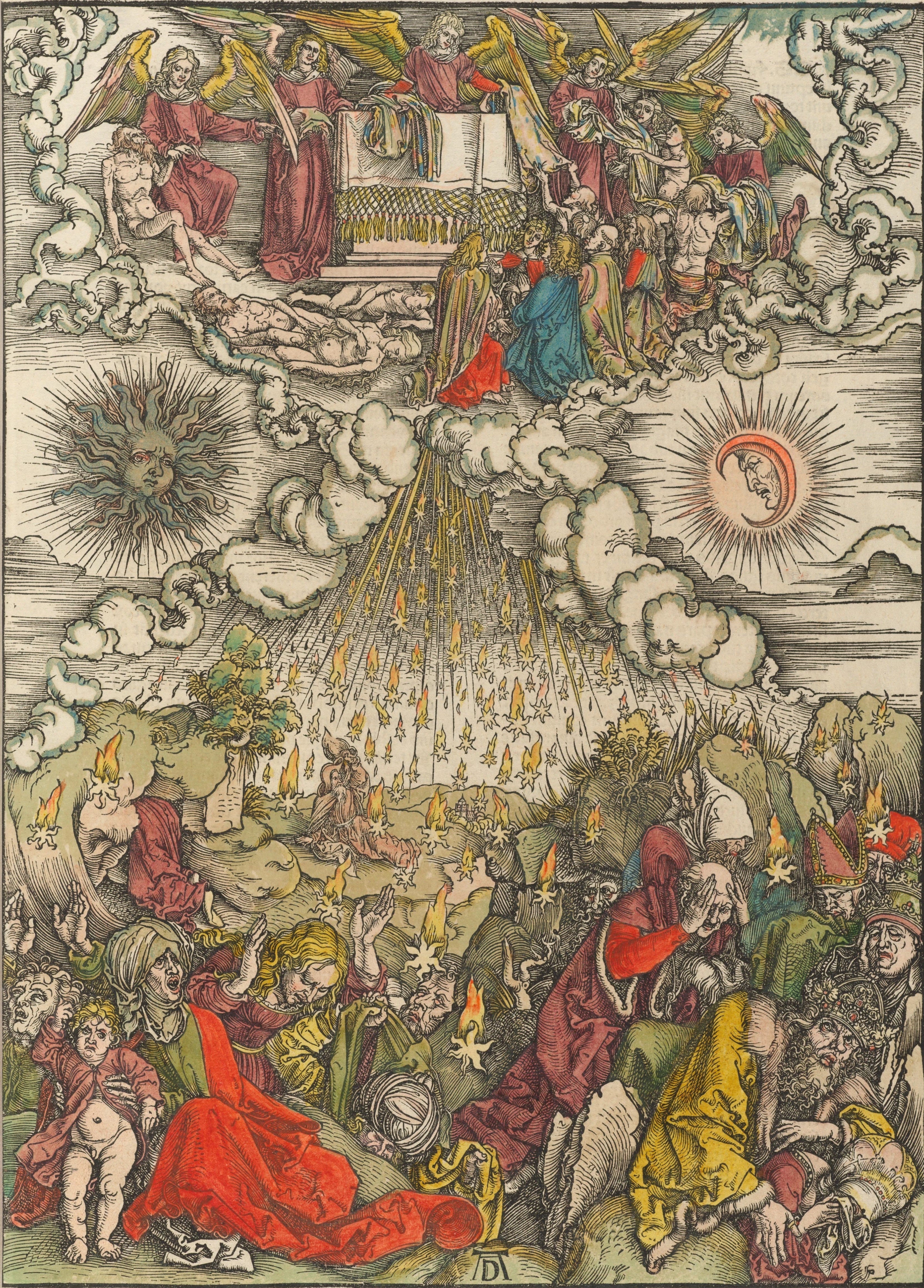 Albrecht Dürer, The Opening of the Fifth & Sixth Seals, from The Apocalypse, 1498. This image portrays, in the human realm, the terror of passively experiencing the fulfillment of destructive prophecy—the darkening of the sun, the bloodying of the moon, and the falling of the stars from heaven (Rev. 6). It also portrays, in the heavenly realm, martyrs who had been crushed by the powers of this world crying out to God for eventual justice to be done on the earth. This image was brought to my attention because my late son Donnie considered it for the cover design of his forthcoming poetry collection Light of an Hour before settling on another, contrasting Dürer image displayed below.