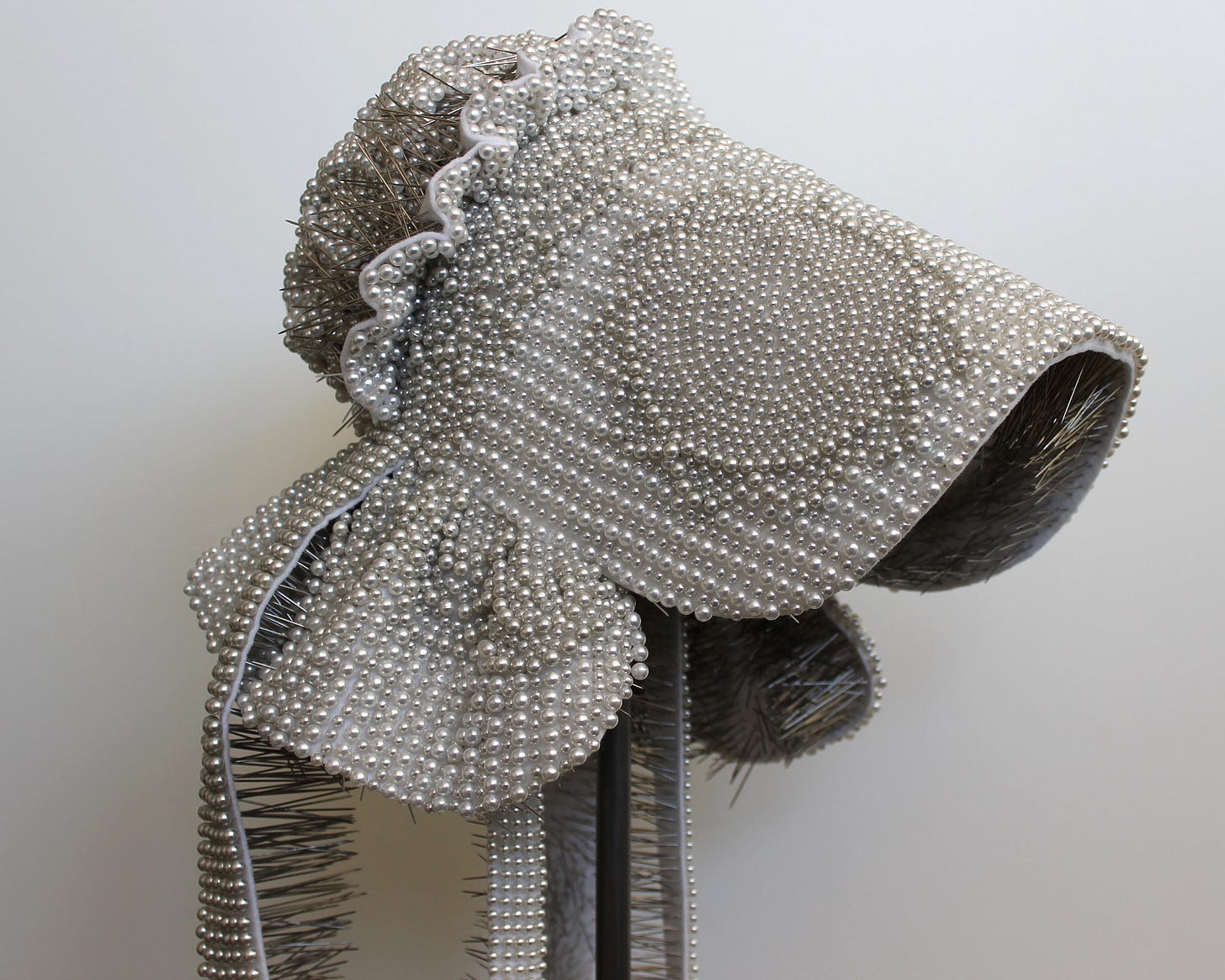 And then just the materiality of it. I mean, I just, I haven't seen it in person, but just looking at the photo, I want to run my hand over those pearl beads on the top of the pins, on top of the bonnet. And I even, like, I want to touch the inside. There's something that feels like I want to engage with it that way. It, it encourages, I think, in the [00:59:00] viewer a very embodied response. Which, again, is like this really, really cool dynamic of the way it's making a comment about bodies and embodiment by the way it revels in materiality and the way it encourages that embodied response from the viewer.