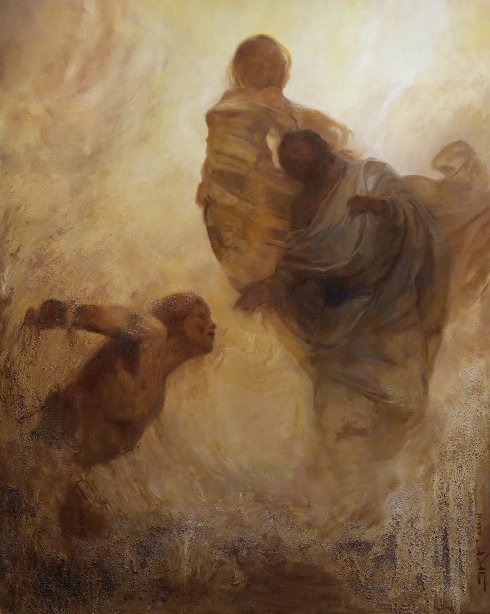 I remember the first time I saw J. Kirk Richards’s painting Breath of Life (From the Dust) (2011). I was 17 years old, a senior in high school, working as a volunteer at the Springville Museum of Art. In 2011, there was a particularly good batch of work entered into the museum’s annual Spiritual and Religious show, and I was delighted to see new works on the gallery walls during a casual walkabout. As I entered the step-down gallery, however, I abruptly stopped in front of an eight-foot-tall painting. Three figures—two male, one female—were engaged in a moment of divine creation. I glanced at the label for interpretive guidance: Breath of Life (From the Dust). The title comes from the creation story in the book of Genesis: “And the Lord God formed man of the dust of the ground, and breathed into his nostrils the breath of life; and man became a living soul” (Genesis 2:7). With this passage in mind, I made myself comfortable on the bench in front of the painting and went to work deciphering the image in front of me: