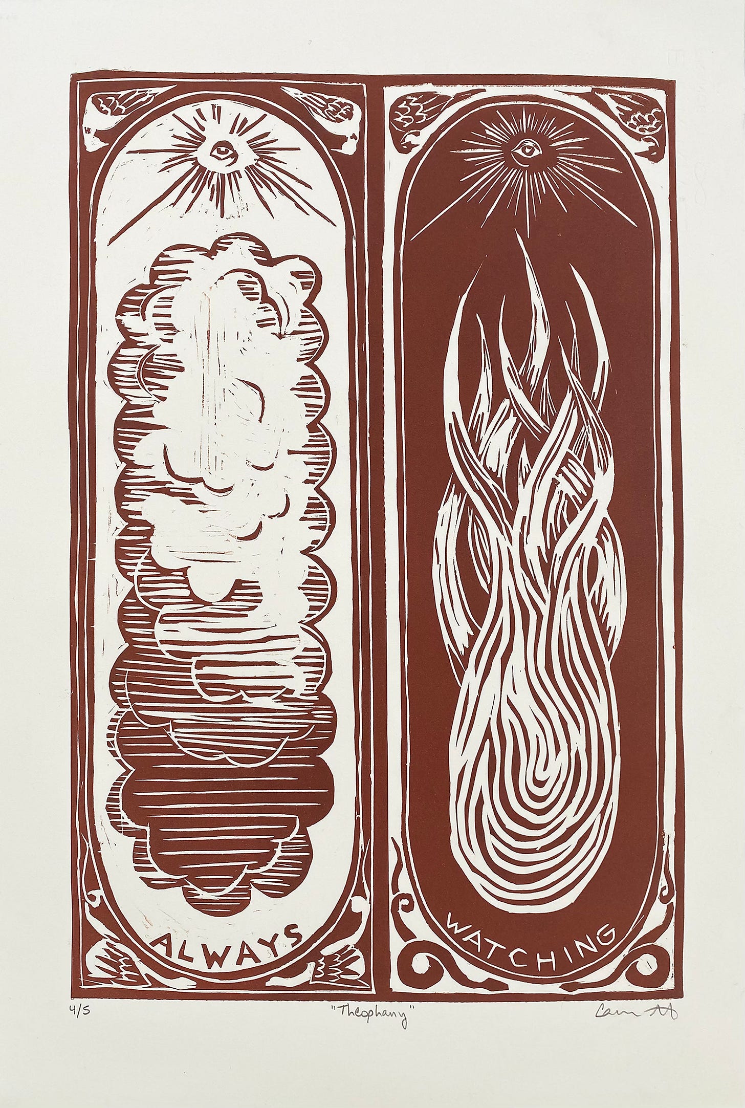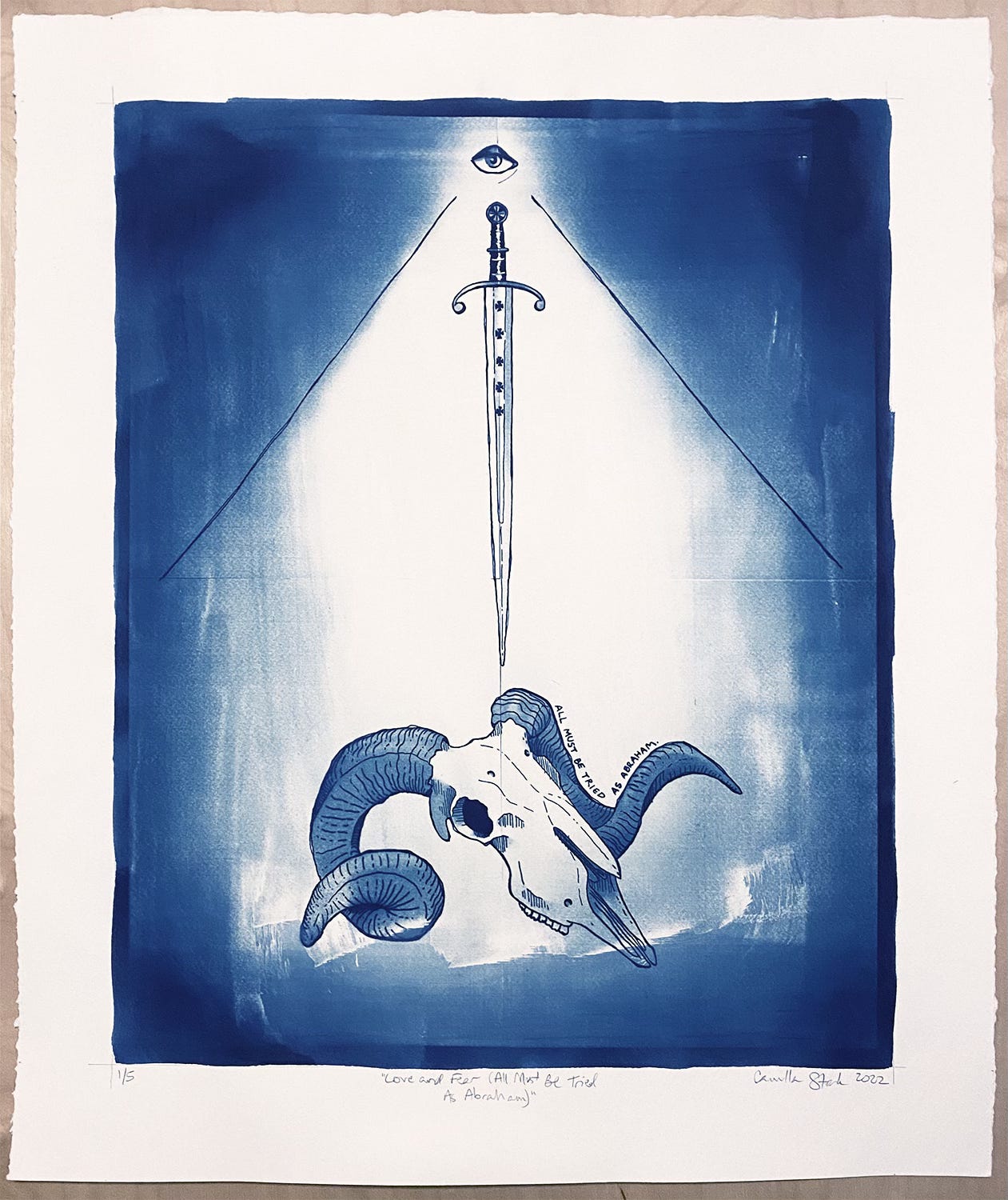 Personally, I work with many mediums. I’ve worked with ink drawing, block printing, cyanotype, embroidery, digital art, and I’m about to get into piecework with fabric. I’m also the author of a self-published graphic novel, The Desert Prophet. But even though I like to play around in many different mediums, the themes in my artwork are very consistent. I work with themes of duality: light and dark, life and death, and love and fear. These themes are important to me because for many years I struggled with obsessive compulsive disorder, specifically scrupulosity, which is OCD manifesting in religious practice and thinking. This scrupulosity put me in a very black-and-white, all-or-nothing type of mindset, and one way I fight back against that tendency is to really embrace duality and the necessity of the coexistence of both sides.