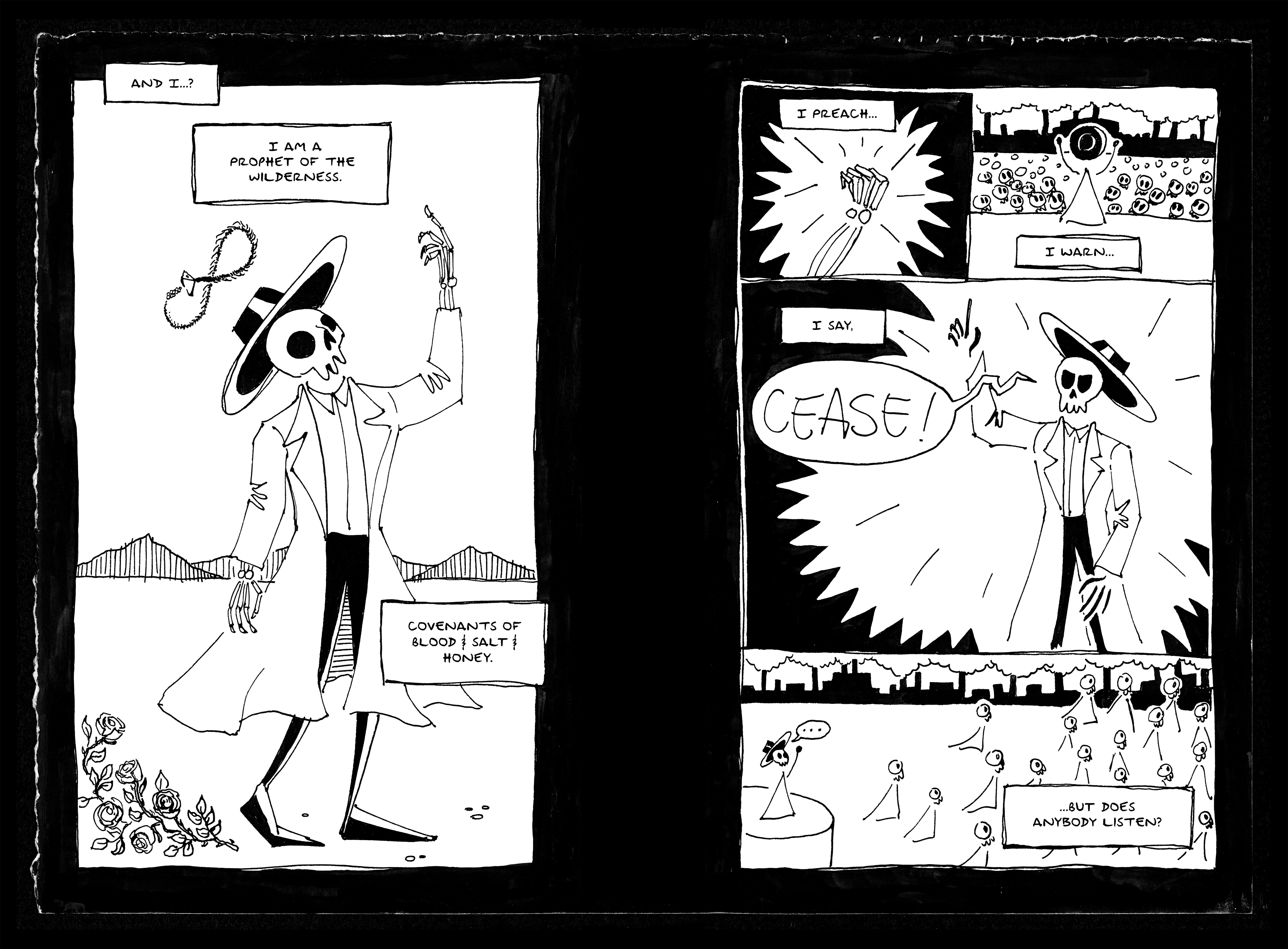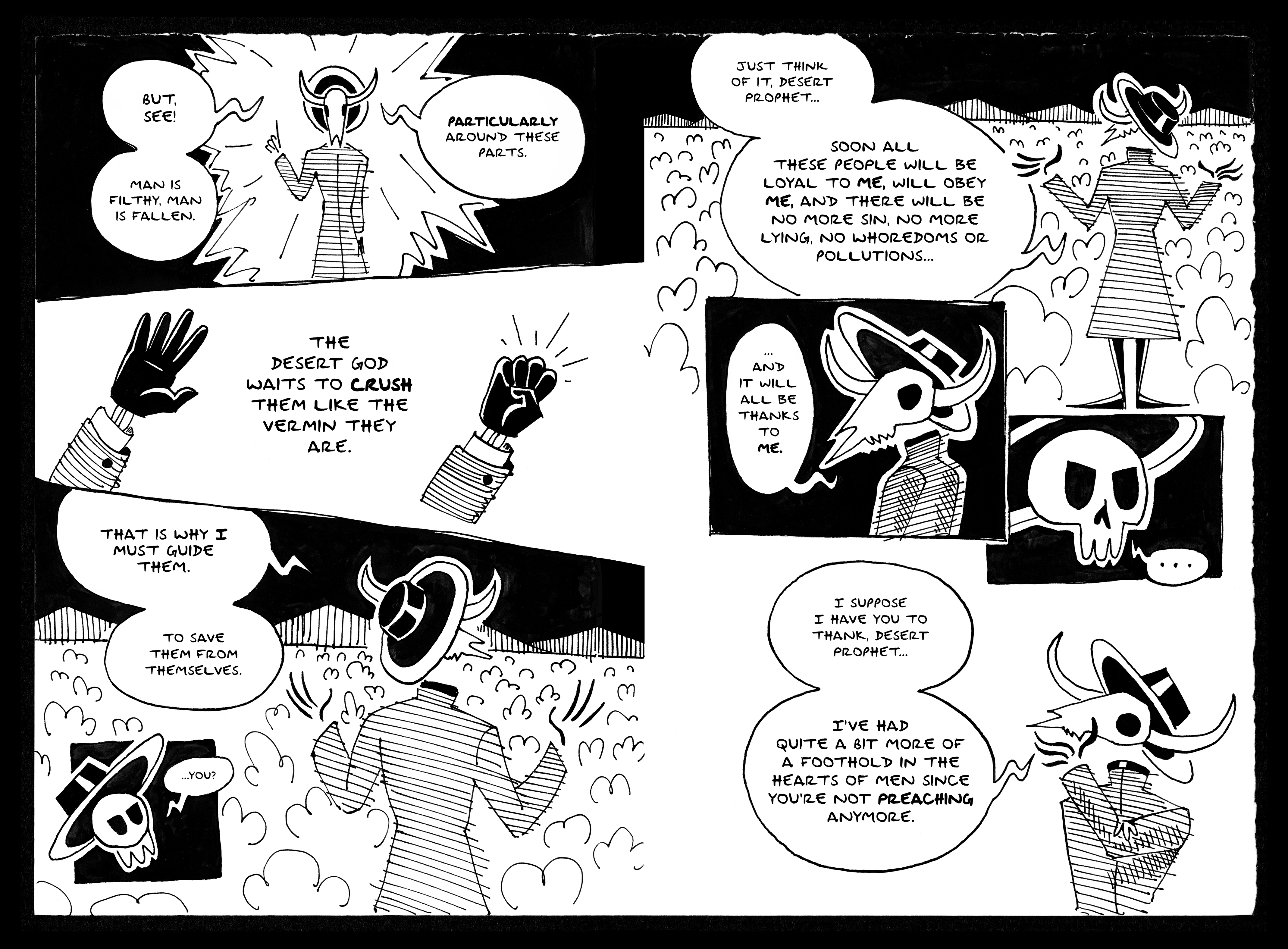 You’ve made some stunning artwork about your experiences with scrupulosity. But today we’re here to talk about your new graphic novel, The Desert Prophet. Can you tell us a little bit about the book and what inspired you to write it?