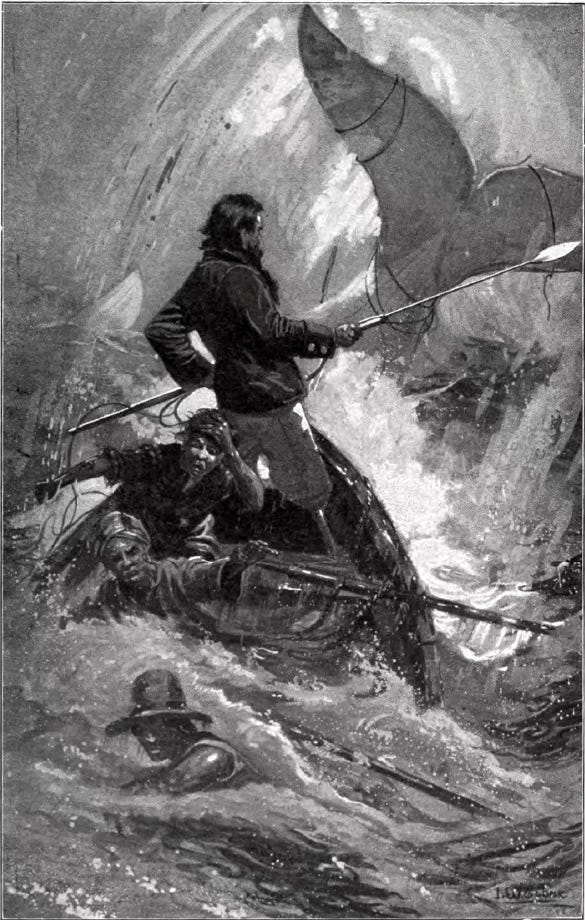 Cuando nos disponíamos a partir, arribó otra nave al pequeño puerto gris. Portaba una flecha de grandes dimensiones en la proa, unida a una larguísima cuerda que se enrollaba en la cubierta. Por lo poco que pudimos saber, su capitán, de figura alta y ancha, como si fuese de bronce macizo, igual que las planchas traídas de Jerusalén, estaba obsesionado con capturar a un gran pez o monstruo marino que había devorado una de sus piernas, por lo que utilizaba en reemplazo una tallada en hueso. De cabello gris y mirada taciturna, una lívida cicatriz le surcaba el rostro . . .